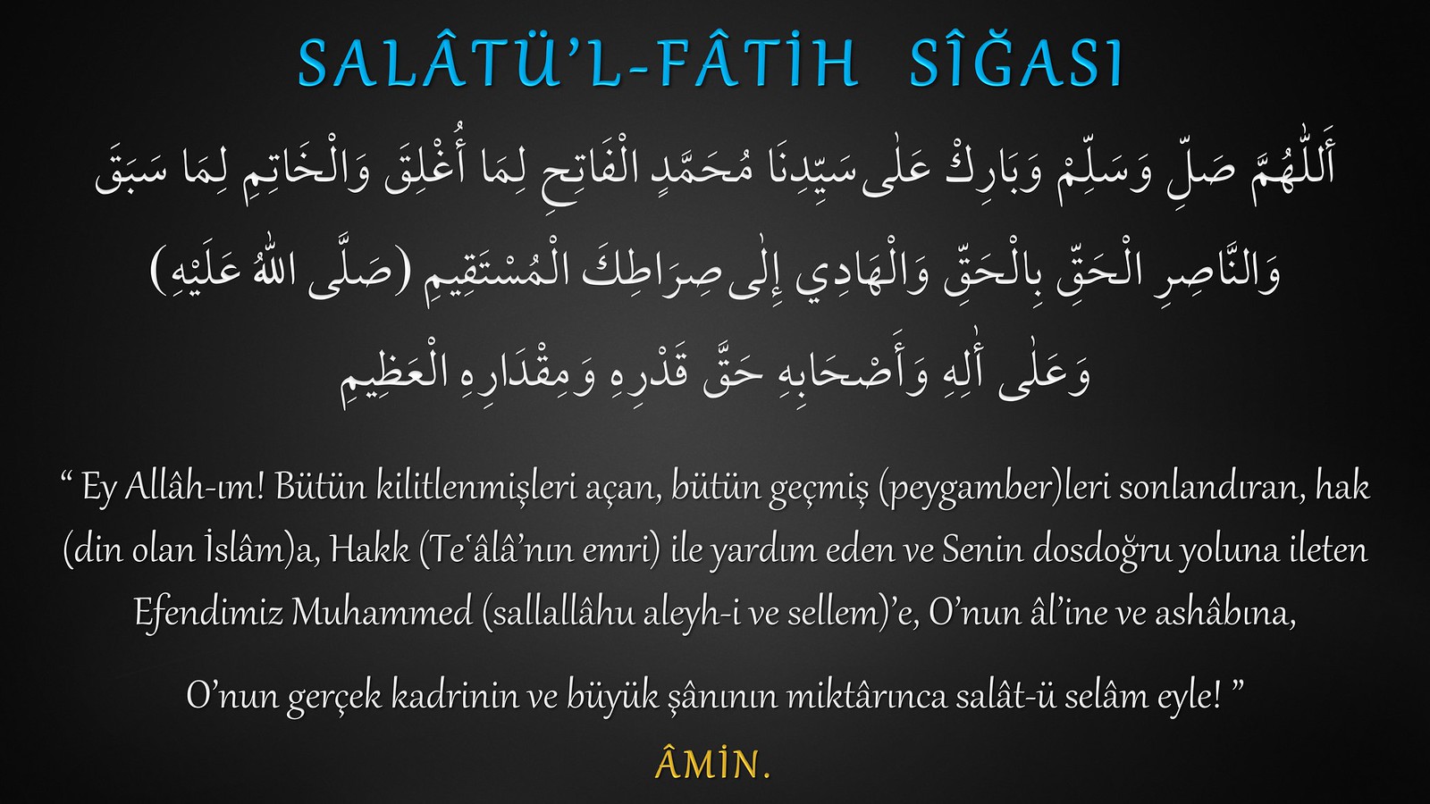 Allahümme salli ve sellim ve barik ala seyyidina Muhammedinil fâtihı limâ uğlika vel hatimi li mâ sebeka ven nâsırıl hakkı bil hakkı vel hâdi ila sırâtıkel müstekıymi sallellahü aleyhi ve ala âlihi ve ashâbihi hakka kadrihî ve mikdârihil aziym